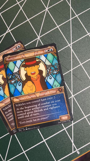 Created as a gift, this MtG card proxy of Professor Layton was made using Adobe Illustrator and Photoshop to look as official as possible. The card frame and main art designs themselves were heavily inspired by the stained look of the Dominaria United card collections.
